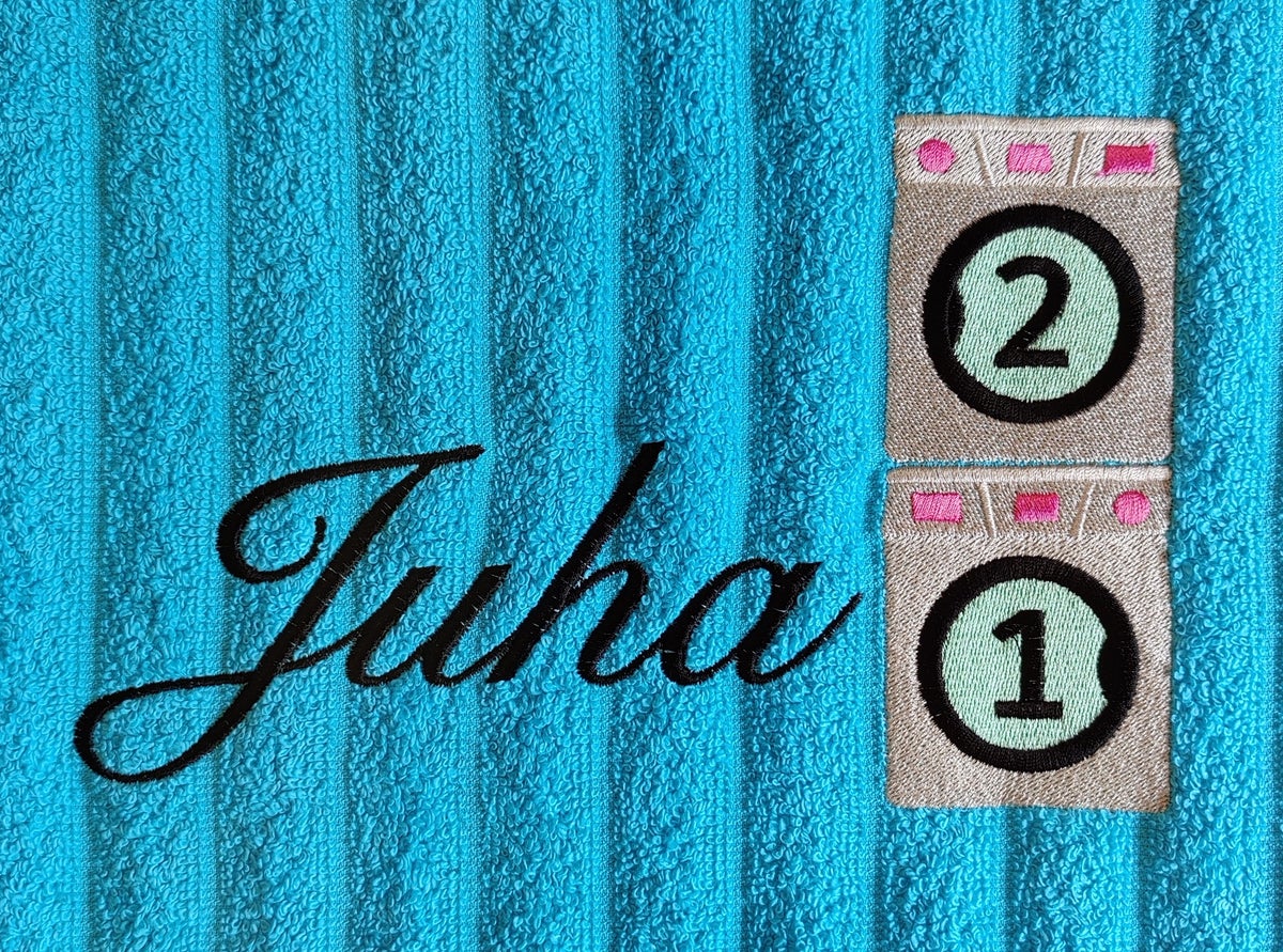 Kirjailu tulee pyyheliinan oikeaan alakulmaan.